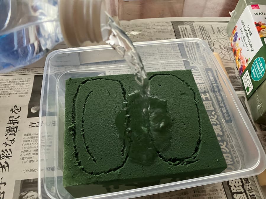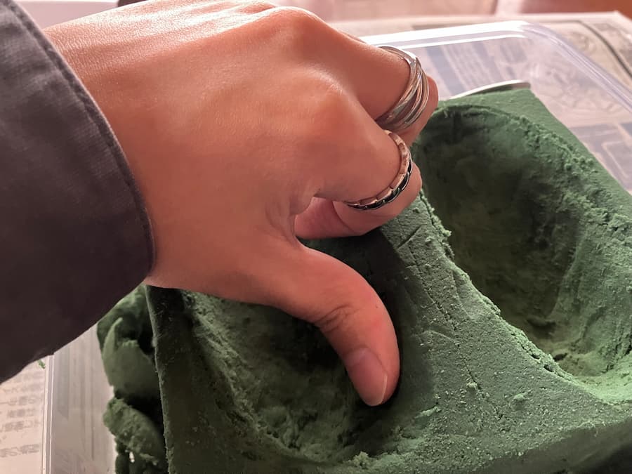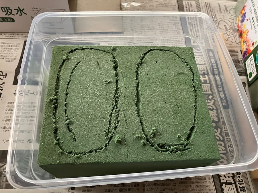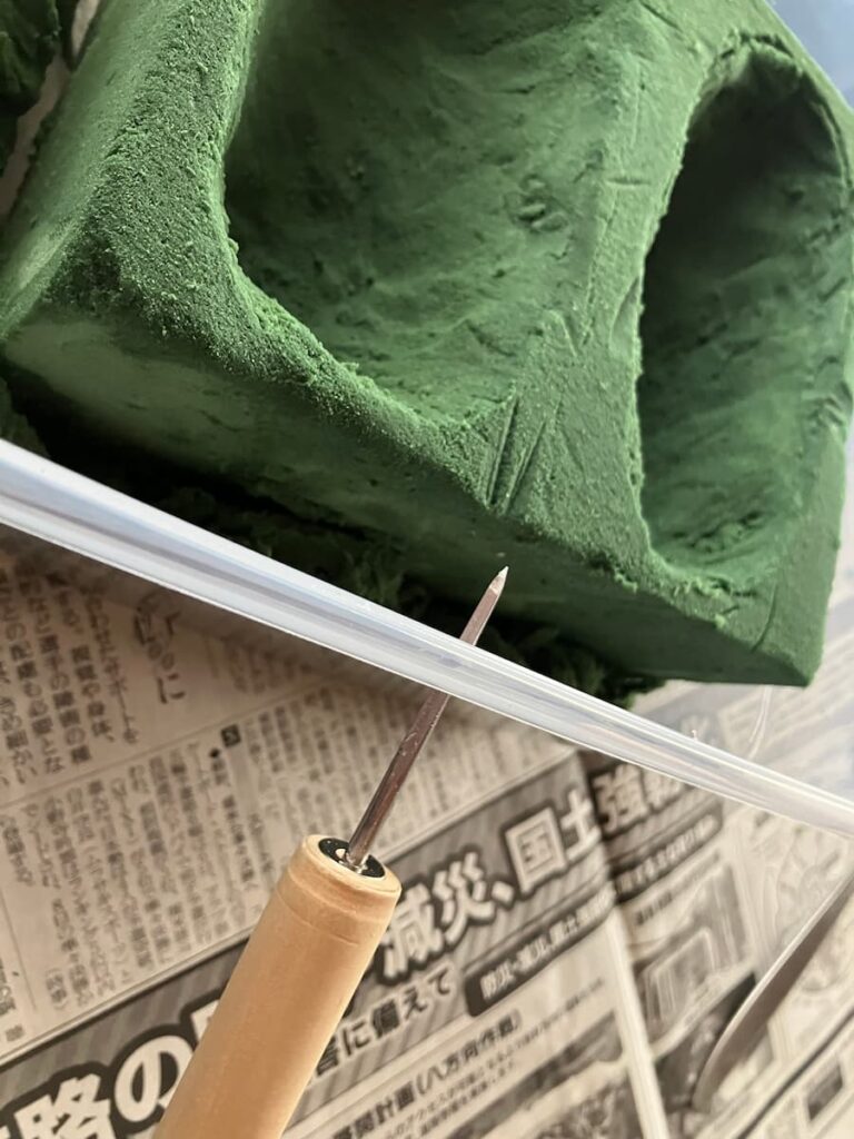 錐を使って吸水スポンジを削って線を引き、人口蛹室の形状を設計する。