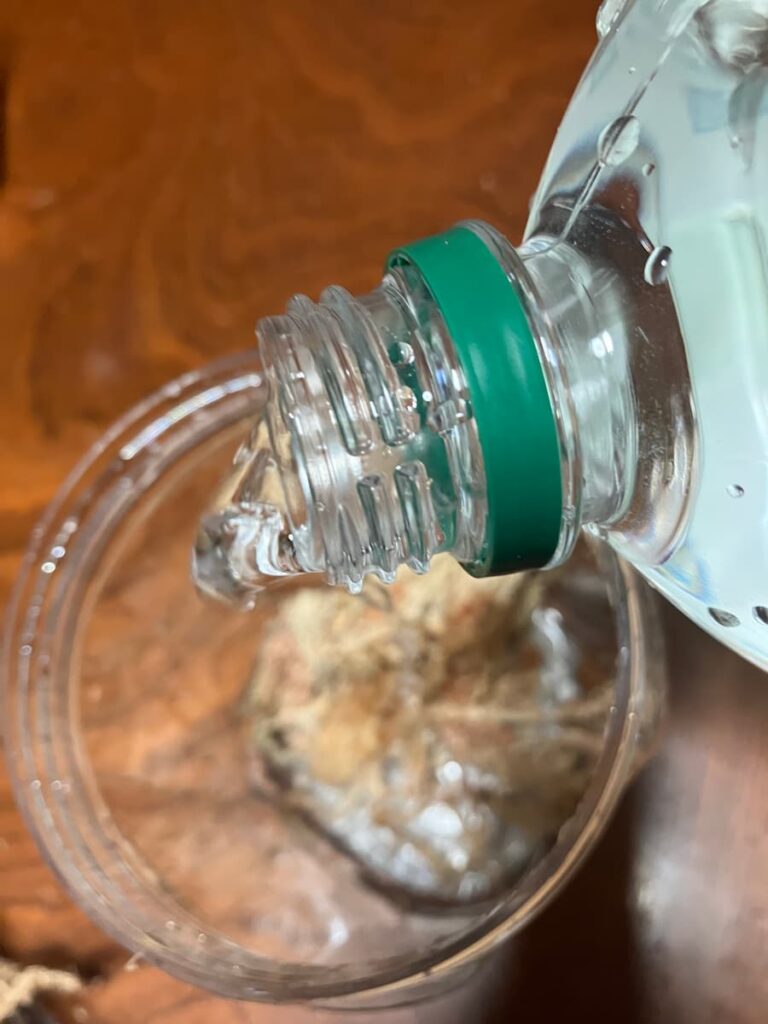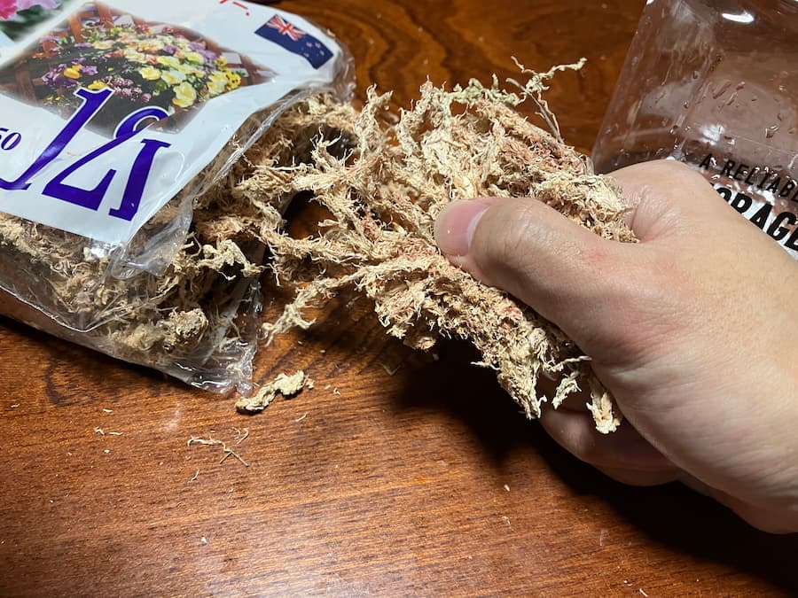 ケース底が水浸しにならない程度まで加水して、水苔を手で混ぜる。