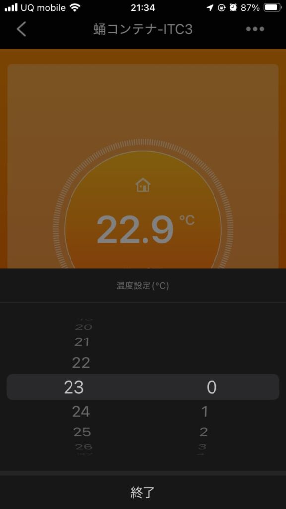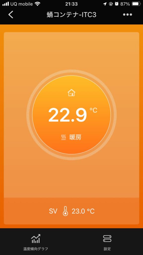 背景色は暖房中ならオレンジ色、冷房中なら青色になる。