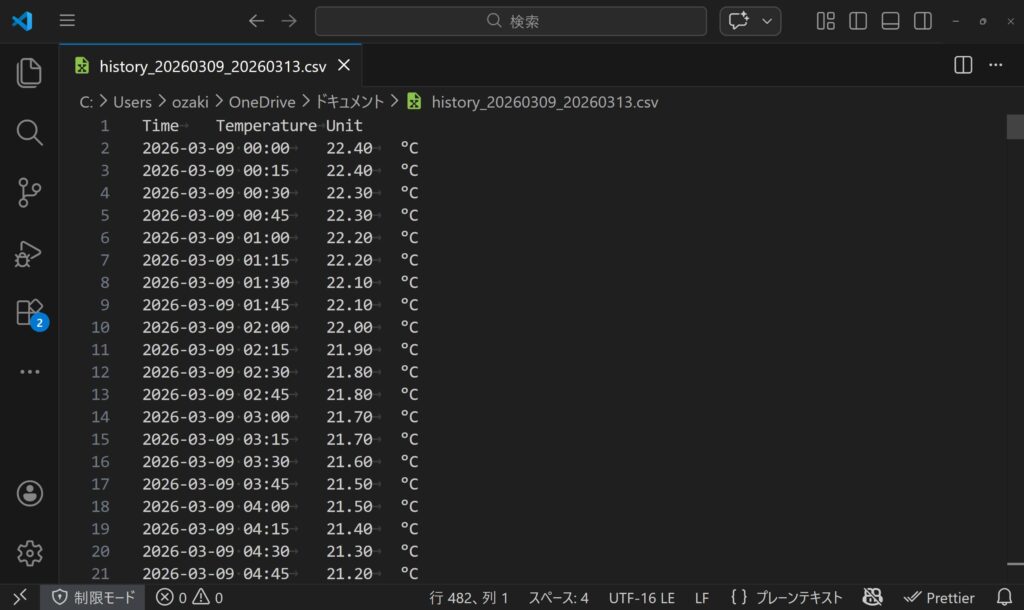 特定の期間を指定して温度推移をデータとして保存可能。